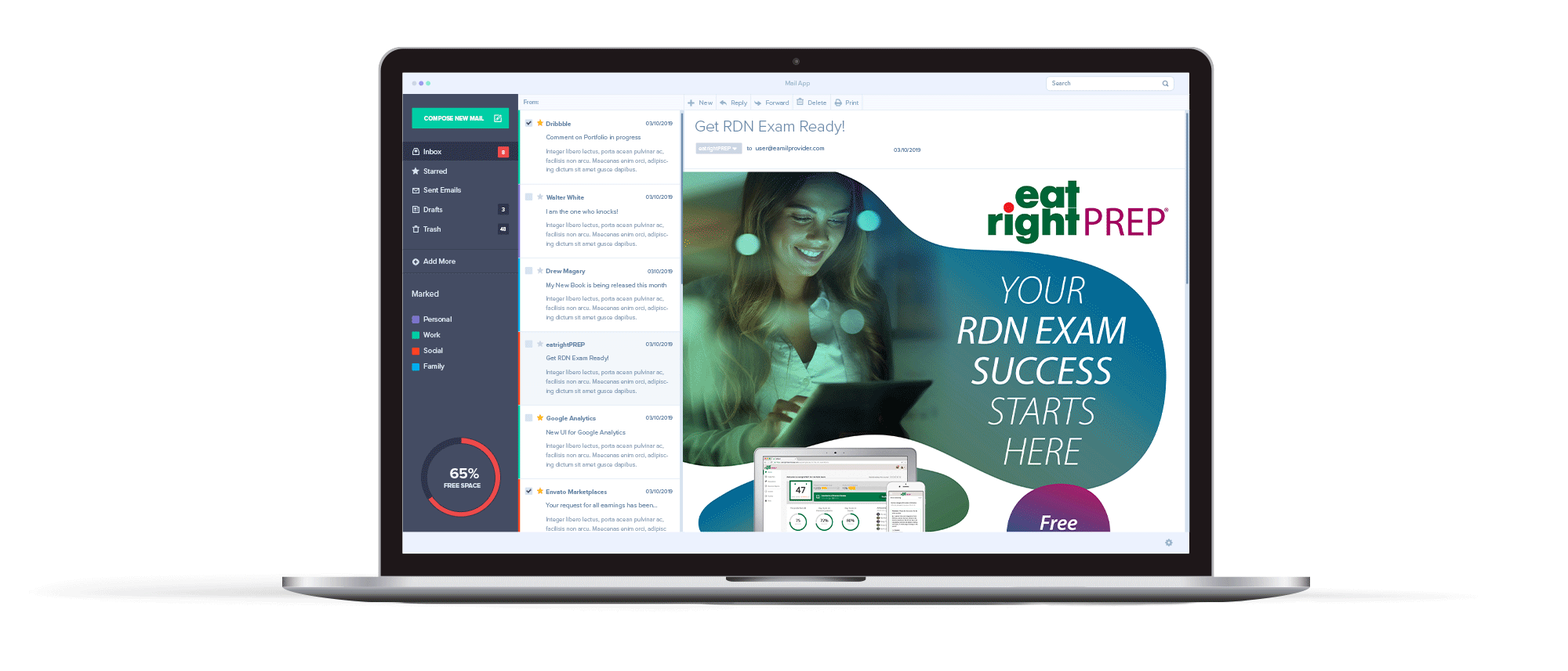 Campaign created to promote eatrightPREP, an online registration exam preparation tool for registered dietitian nutritionists. Pieces include an ad, an HTML email design/build, social media graphic, display ads, a web image asset and an email banner.
